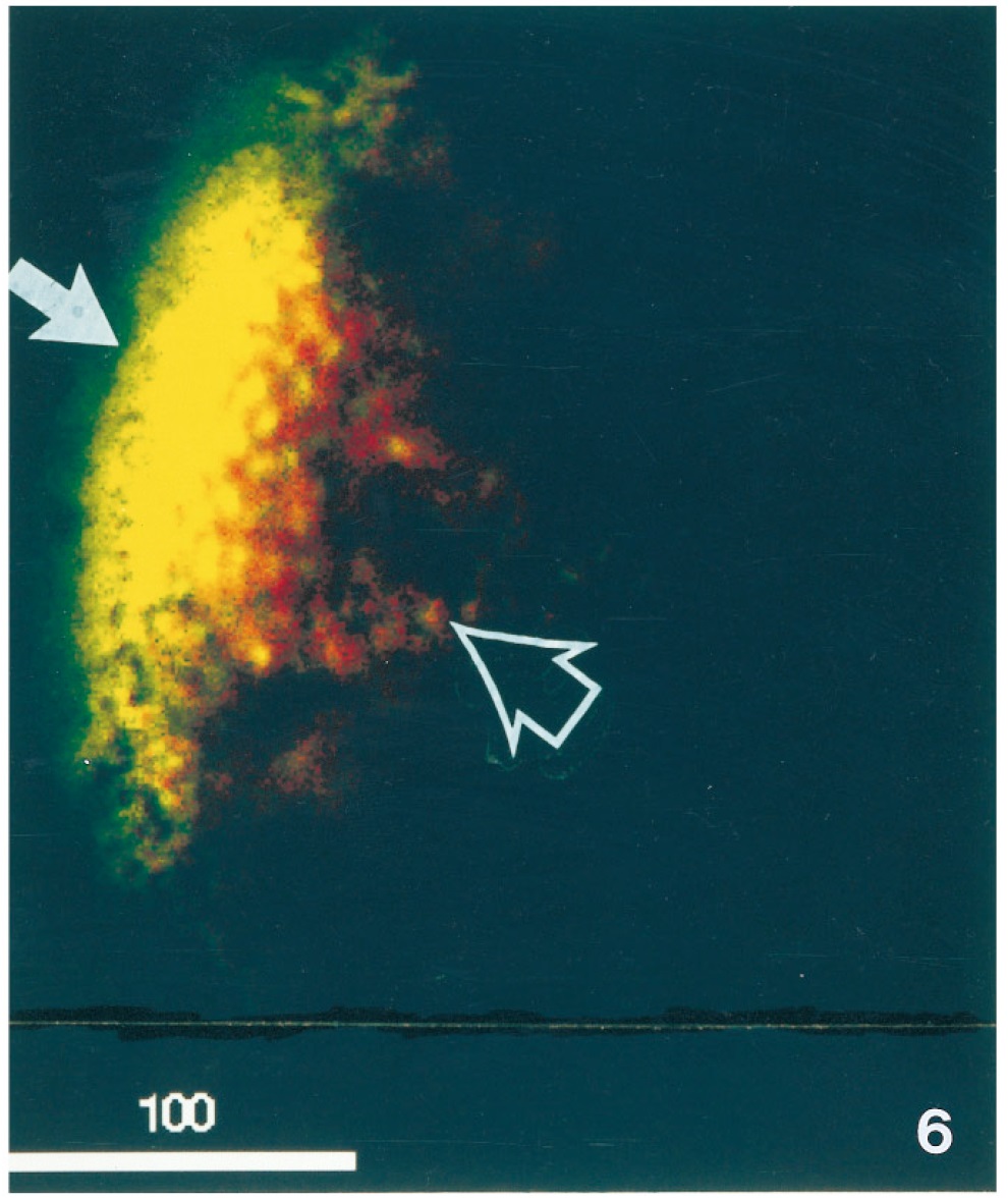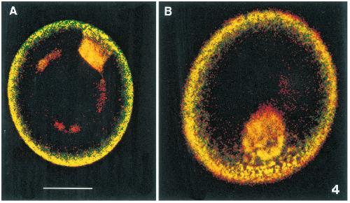 FIG. 6. Co-injected Vg1 and Xlsirt translocate to the vegetal cortex in living stage 2 oocytes. Texas red-labeled Vg1 (open arrow) and