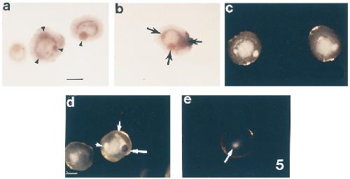 The oocytes were stained and the injected Xlsirt RNA was detected within all of the precloud structures (arrowheads). (b) Another example