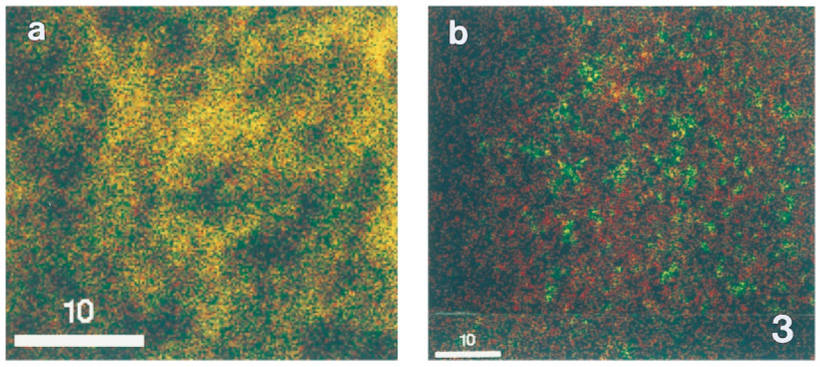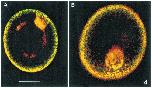 into stage 1 oocyte. The area of overlap between the two RNAs appears yellow. (b) Segregation of the two different RNAs into differenttype