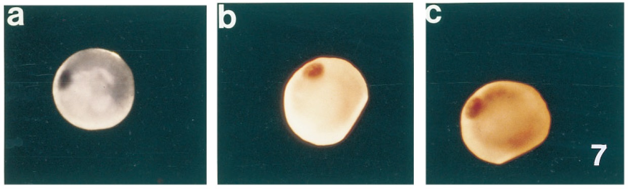 of a pre-stage 1 oocyte injected with exogenous Xlsirt RNA. (c) Control oocytes that were not injected but went through the staining