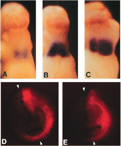Fig. 3. Increased regions of marker gene expression at early stages of cardiac differentiation. In situ hybridization of stage 26 embryos to detect cardiac troponin I expression indicates that cardiac differentiation begins in two symmetrical regions within the heart field (A) and that these regions are enlarged in XNkx-2.5 and XNkx- 2.3 injected embryos (B,C). (A) Water injected embryo. (B) XNkx- 2.3 injected embryo with symmetrically large troponin expressing regions. (C) XNkx-2.3 injected embryo with asymmetrically large troponin expressing region. The left side which received the injection is larger. Fluorescence microscopy of stage 25 embryos injected into the left dorsal vegetal blastomere at the 8-cell stage demonstrates extensive cell mixing between the left and right sides in the heart region. This cell mixing may result in significant overexpression of injected RNAs on both the left and right sides leading to expansion of the heart field on both sides. (D) Anterior view of stage 25 embryo injected with tetramethylrhodamine-conjugated dextran showing mixing on the ventral side. (E) Anterior view of stage 25 embryo injected as in D but with much less cell mixing. In each case, the plane of the dorsal/ventral axis is indicated by opposing arrowheads.