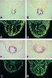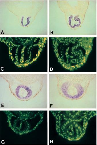 Fig. 4. Paraffin sections demonstrate an increase in myocardial volume and in the number of myocardial cells in XNkx-2.3 and XNkx-2.5 injected embryos. In situ hybridization to detect cardiac troponin I transcripts (the purple color in A,B,E,F) was completed before sectioning. Nuclei were visualized in C,D,G, and H with the fluorescent nuclear stain SYTOX Green (Molecular Probes). (A) Cross section through the heart region of a water injected embryo at stage 33. (B) Section equivalent to that in A from a XNkx- 2.5 injected embryo. (C) Section adjacent to that in A. (D) Section adjacent to that in B. (E) Cross section through the heart region of a water injected embryo at stage 31. (F) Section equivalent to E from a XNkx-2.3-injected embryo. (G) Same section as in E. (H) Same section as in F. A-B were photographed at 00. C-H were photographed at 00.