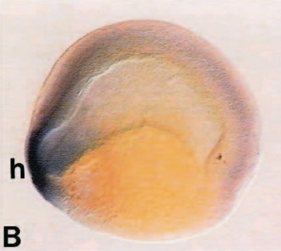 Fig. 1. XNkx-2.3 and XNkx-2.5 are expressed in similar regions of the developing embryo. In situ hybridization with antisense XNkx-2.3 and XNkx-2.5 probes demonstrates that both of these sequences are expressed in early heart progenitors (h) and are maintained in cardiac tissue throughout development. XNkx-2.3 and XNkx-2.5 are also expressed in similar, but distinct regions of anteriorendoderm (e) and pharynx (p). (A) Stage 18 XNkx-2.5 stained embryo. (B) Stage 18 XNkx-2.3 stained embryo. (C) Stage 28 embryos. (D) Stage 37 embryos. In C and D the XNkx-2.3 stained embryo is on top.