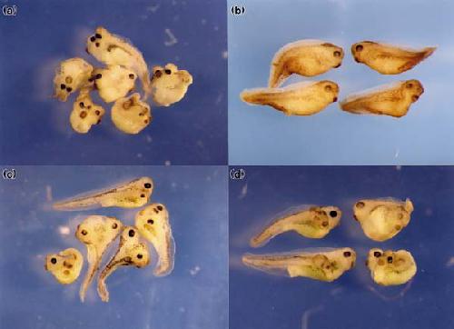The effect of Xdd1 mRNA on axis-inducing ability of Xwnt8 and Xβcat mRNAs. One ventro-vegetal blastomere of 4â8 cell embryos was injected with (a) 2 pg of Xwnt8 mRNA, (b) 2 pg of Xwnt8 mRNA plus 1.5 ng of Xdd1 mRNA, (c) 0.8 ng of Xβcat mRNA of (d) 0.8 ng of Xβcat mRNA plus 1.5 ng of Xdd1 mRNA.