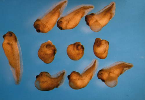 Wild-type Xdsh mRNA corrects dorso-posterior deficiencies caused by injections of Xdd1 mRNA. Injections of wild-type Xdsh (top three embryos), Xdd1 (middle row) and a mixture of both Xdd1 and wild-type Xdsh (bottom row) were performed as described in Figure 2. A control uninjected embryo is shown on the left.