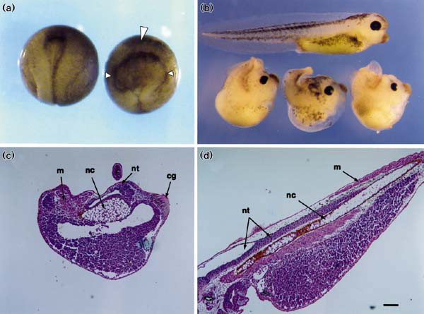 Embryos microinjected with Xdd1 mRNA develop a specific morphogenetic defect. Two-cell embryos were injected dorsally with 1 ng of each mRNA into each blastomere. (a) Stage 14 neurulae injected with Xdd1 mRNA (on the right) and with Xdd2 mRNA (on the left). Note the failure of neural folds (shown by two small white arrowheads) to close into a neural tube. The cement gland develops at the anterior end (large arrowhead); the closed blastopore is visible at the posterior end. The embryo injected with Xdd2 mRNA has a normal neural tube and is indistinguishable from uninjected embryos and from embryos injected with wild-type Xdsh (not shown). (b) Stage 40 tadpoles. Top: control embryo (uninjected); bottom: Xdd1-injected embryos with posterior deficiencies. (c) Sagittal histological section of Xdd1-injected embryo (stage 40); (d) sagittal section of a control embryo (stage 40). Abbreviations: m, muscle; nc, notochord; nt, neural tissue; cg, cement gland. The bar in (d), which also refers to (c), is 200μm.