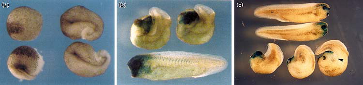 The effect of Xdd1 on cell movements may depend on cellâcell interactions. (a)Xdd1 inhibits morphogenetic movements of the dorsal marginal zone. Dorsal marginal zone explants were isolated at stage 10 from embryos that had been injected earlier with 1 ng of Xdd1 mRNA (on the left) or Xdd2 mRNA (on the right). (b,c) Lineage tracing of Xdd1-microinjected embryos. (b) Embryos were injected at eight-cell stage into the dorso-animal blastomere with β-gal mRNA only (bottom embryo) or with β-gal mRNA plus Xdd1 mRNA (two top embryos). (c) Two top dorso-animal blastomeres at the 32-cell stage were injected with 5 nl of β-gal RNA (two top embryos) or Xdd1 plus β-gal RNAs (three bottom embryos). The arrowhead points to the area in which developmental abnormalities are observed, despite the absence of Xdd1 and β-gal RNA (unstained). Embryos were cultured until stage 35, then fixed and β-gal-expressing cells were visualized histochemically.