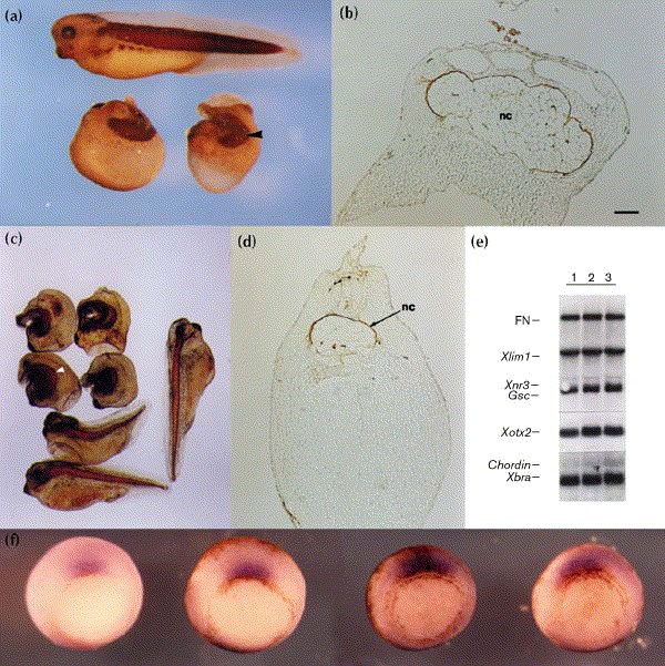 Figure 4. Early marginal zone markers and mesodermal tissue differentiation are not affected by Xdd1. (a) Whole-mount immunochemical staining with muscle-specific 12/101 antibodies. Top: control embryo; bottom: two embryos injected dorsally with Xdd1 mRNA. Arrowhead points to a somite. (b) Cross-section of an Xdd1-injected embryo after whole-mount staining with notochord-specific MZ15 antibodies. Brown staining outlines a sheath around notochord (nc). Bar in (b), which also refers to (d), is 150 μm. (c) Whole-mount staining with MZ15 antibodies. Top left: four embryos injected with Xdd1 mRNA; white arrowhead points to notochord. Bottom left: two embryos injected with wild-type Xdsh mRNA; control uninjected embryo is shown on the right. (d) Cross-section of a control uninjected embryo stained with MZ15 antibodies. (e) Northern analysis of early marginal zone markers in control embryos (lane 1) and in embryos injected dorsally with Xdd1 (lane 2) or Xdsh (lane 3) mRNAs. Total RNA was prepared when control embryos reached stage 10.5. Xbra is a general marginal zone marker. Xotx2, goosecoid (Gsc), Xlim 1 and chordin are dorsal marginal zone markers. Xnr3 is expressed in the superficial layer of the Spemann organizer. Fibronectin (FN) mRNA is a control for loading. (f) Xdd1 does not alter the localization of chordin transcripts. In situ hybridization of stage 10.5 gastrula embryos with chordin anti-sense RNA probe. Far left: uninjected albino embryo; centre left: uninjected pigmented embryo; right: two pigmented embryos injected with Xdd1 mRNA in the dorsal margin at the two- to four-cell stage.
