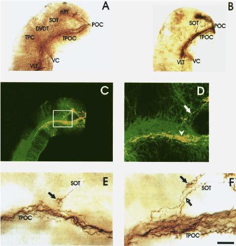 D: High power confocal image at the junction of the TPOC and SOT showing NOC-1 expressing axons in the SOT (arrow) and in the ventral portion of the TPOC (arrowhead).
