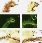 C and D: Higher magnification of views A and B, respectively. Both axons in the SOT at this stage express NOC-1 ( thin arrows). The dashed line in C represent the dorsal limit of the TPOC ( large arrows) as determined by acetylated- alpha-tubulin expression in D. The NOC-1 positive SOT axons grow ventrally past axons in the dorsal TPOC and only turn and grow caudally after contacting NOC-1 positive axons in the ventral TPOC. E: At stage 28, prior to the formation of the SOT, NOC-1 expressing axons in the TPOC course as a single discrete bundle throughout its entire course (large arrow). The rostral surface of the prosencephalon is towards the bottom of the panel. F: Acetylated-a-tubulin expression in the same an- imal as E. There are many axons in the dorsal TPOC which do not express NOC-1 at this stage. These axons defasciculate and are present in the dorsal regions of the TPOC caudal to the eye vesicle (arrowheads). Bar: 100 pm (E-F); 50 pm (A-D).