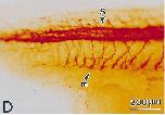 FIG. 7. Inhibition of primary motor nerve development by NF-MDT. Embryos were injected with NF-MDT mRNA into a single blastomere at the 2-cell stage and later stained as wholemounts with the anti-MAP1 antibody. (A) Lateral view of mid-level myotomes on the injected side of a stage 28 larval tadpole, showing inhibition of motor axon development. (B) The uninjected contralateral side of the same animal at the same rostrocaudal level as in A, showing normal motor nerve development. (C) Lateral view of tailsomites on the injected side of a stage 37/38 tadpole. (D) The contralateral uninjected side of the same tadpole as in C. The injected side (C) had fewer motor nerves emanating from the spinal cord than normal (D). Arrowheads at S point to the spinal cord. Arrowheads at m point to an example of a motor nerve projecting to the somites. In these panels, rostral is to the right. (The negatives were reversed when printed to maintain the same orientation in all panels.) The scale bars in B and D also apply to A and C, respectively.