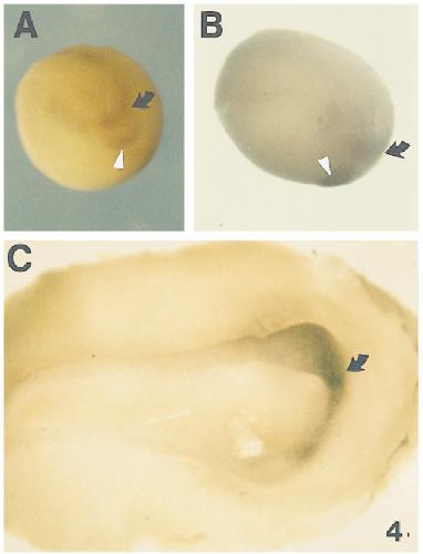 embryo, X-dll3 expression is restricted to the anterior region of the closed neural tube (black arrow) and in the cement gland (white arrow).