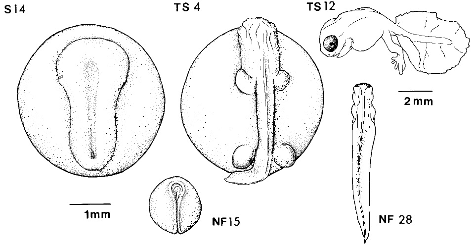 neurula of X. laevis (NF 15). A TS 4 E. coqui embryo has not yet formed gill rudiments or eye pigment, similar to a NF 28 X. laevis