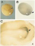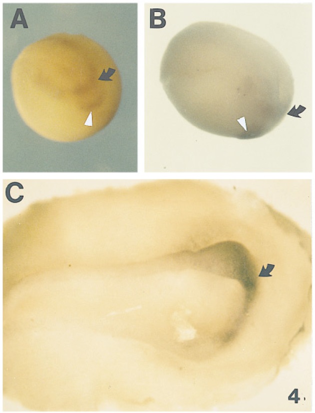 (A) Dorsolateral view of a stage 14 X. laevis embryo. (B) Lateral view of a stage 15 R. pipiens embryo. (C) Dorsal view of a stage 14 E.