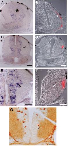 at the level of the developing optic tectum shows individual digoxygenin-positive cell bodies that lay dorsolaterally (C, E), in close