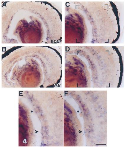 trkB (F) probes, respectively. The retinal areas outlined by the brackets in C and D are shown as high-magnification photomicrographs