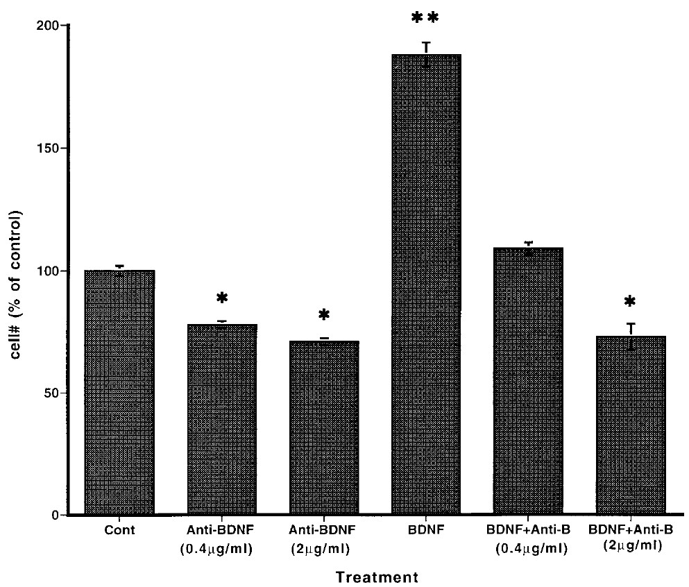 comparison, absolute numbers in NM/ 2% fetal calf serum are: control 865 { 44.3; Anti-BDNF (0.4 mg/ml) 642 { 6.9; Anti-BDNF (2 mg/