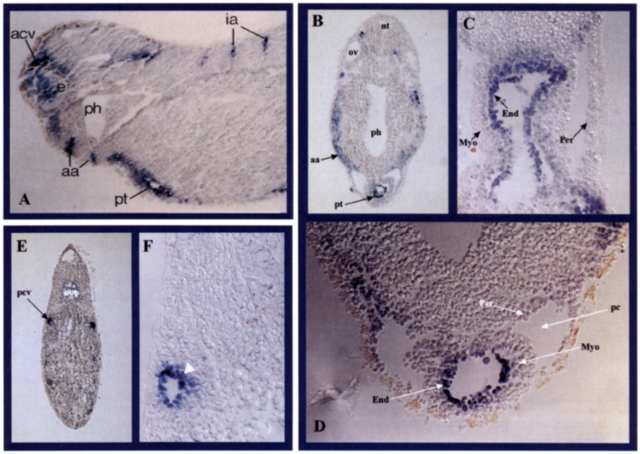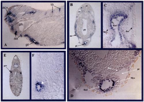 Fig 6. Localization of X-msr transcript in the endothelial layer. (A) Parasagittal section of a larva at stage 32-33 showing the labeling in the procardiac tube (pt) and some primary blood vessels, such as the anterior cardinal vein (acv), aortic arches (aa) and intersomitic arteries (ia). (B) Transverse sec- tion at the level of the procardiac tube (pt). The lateral staining is in the aortic arch (aa). (C,D) Magnification of longitudinal and transverse procardiac tube sections. Note the exclusive labeling in the endocardium (En); myocardium (Myo) and pericardium (Per) am unstained. (E) Transverse section at the trunk level showing expression in both posterior cardinal veins (pcv). (F) Magnification of a transverse section at the trunk level. Note that the labeling is localized in the inner endothelial layer (white arrowhead). Abbreviations: e, eye; ph, pharynx; nt, neural tube; ov, otic vesicle; pc, pericar- dial cavity; not, notochord.