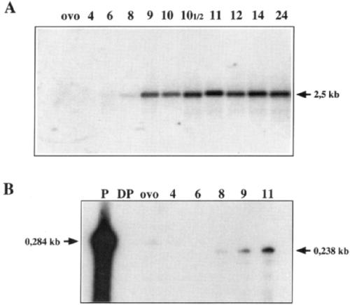 Fig. 3. Kinetics of X-msr gene expression. (A). Northern blot analysis. Ten pg of total RNA from oocytes (ovo) or staged embryos were loaded and