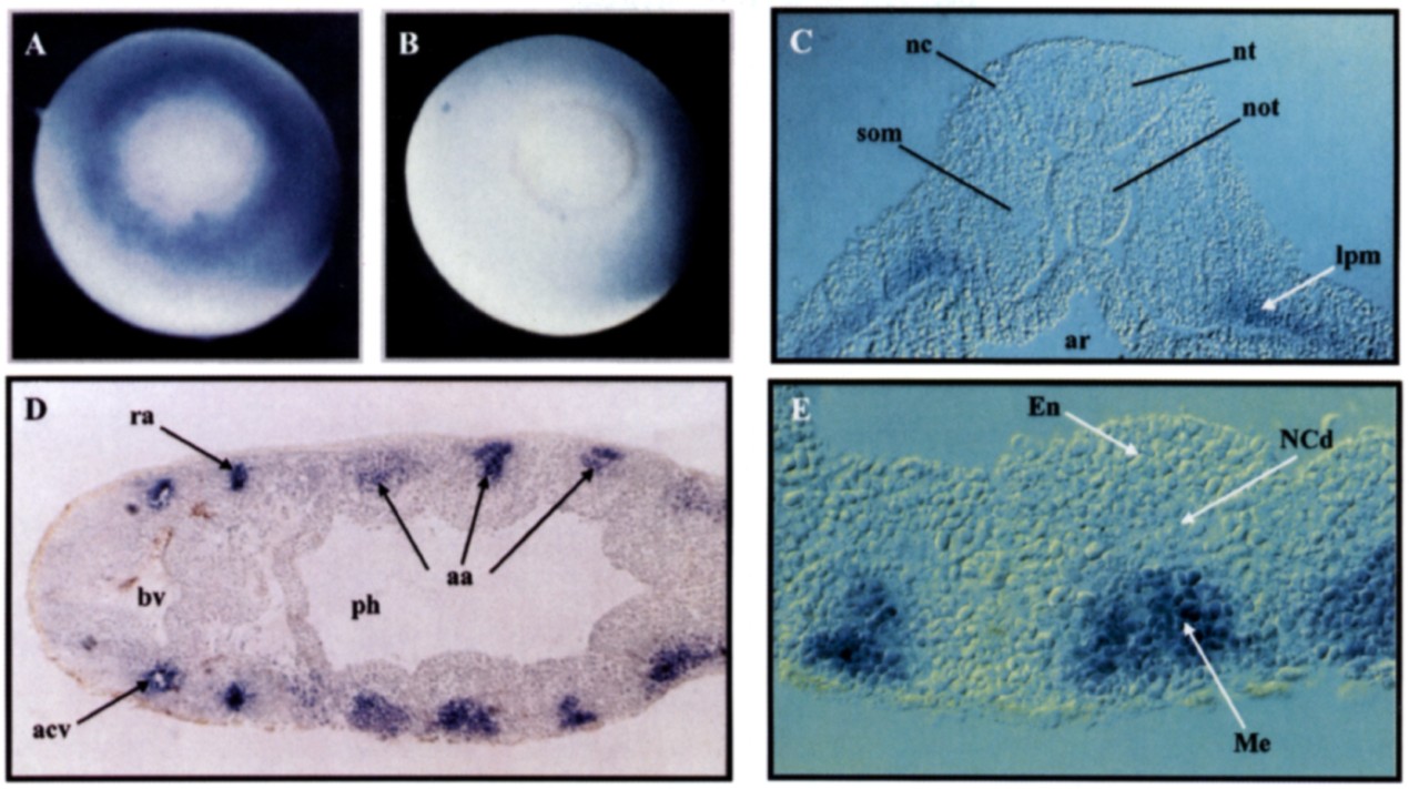 Fig 5. Embryonic origin of the cells expressing X-mu transcript. (A,B) Vegetal view of whole mount in situ hybridization of gastrulas from UV- ventralized (A) and lithium-dorsal&d (B) embryos, respectively. Note that the staining is localized all around the yolk plug in the ventralized embryo while it is absent in dorsalized embryo. (C) Thin transverse section from the anterior part of late neurula. Note that the labeling is exclusively localized in the lateral plate mesoderm (Ipm), and absent in axial and paraxial derivatives such as neural tube (nt), notochord (not), neural crest cells (nc) and somitic mesoderm (som). (D) Transverse section inside the branchial arches of a stage 32-33 embryo showing the labeling in the forming aortic arch (aa). Note also the staining in the retinal artery (ra) and in the anterior cardinal vein (acv). (E) Magnification of the branchial arches from (D), showing that cells of the visceral arches originating from the mesoderm are specifically labeled by the X-mu probe, whereas those deriving from endoderm (En) or neural crest (NCd) are unstained. Abbreviations: ar, archenteron; ph. pharynx; bv, brain vesicle.