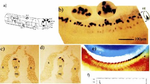 Fig. 5. Spatial expression of xTrkB in Xenopus laev;s embryos. la,b,d, and e) Lateral views of cleared embryos at stages 21/22.22/23.24 and 33/