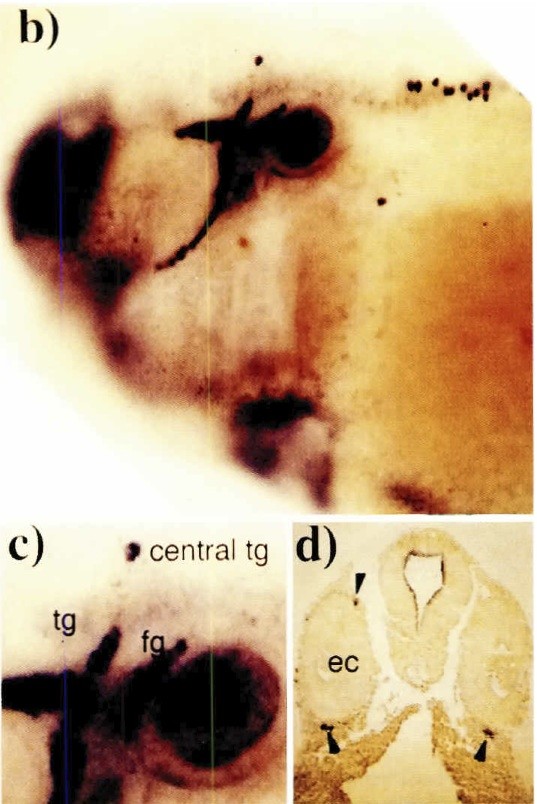 Diagram (NOTE: see original paper for diagram- diagram not in Xenbase) indicating the major cranial sensory nerves. The approximate extents of the trigeminal Nth) ganglion rtg}, facial (VI/th) gang/ion ((g), the vestibularor acoustic (VJJlth)nerve (vn), the glossopharyngeal (lXthJ ganglion (gg), the vagus (Xth) ganglion and the latera/line ILL) are indicated by chequered shading. The regions positive for xTrkB are shown in black. The ophthalmic (og), maxillary (mx) and mandibulary (mdJ branches of the tgare also indicated as are the fore (FB), mid (MBJ, and hindbrain (HB) regions. the rhombomeres (r2. r4 ete), the eye cup (ee) and the otic vesicle fovl. (b and enlargemenr in cl Lateral view of the head region of a stage 33/34 embryo hybridized with a mixture of JA and H probes (see Fig. 4). (d) Lateral cross- section though the mid-brain. eye region of a stage 33/34 embryo after in situ. whole-mount hybridization. Hybridization in the tg is seen above and below the eye cups (ec). Note in (b.c and dl staining within the brain and otic cavities was very variable between samples and is most probably artlfactual staining due to a non-specific sequestration of probe. For example in Idl staining within the brain cavIty occurs only at the inner cavity surface. not within the brain tissue.