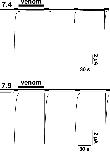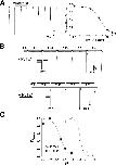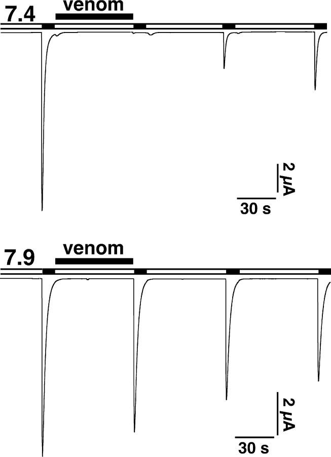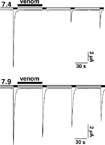 Figure 1. The inhibition by PcTx1 is pH dependent. ASIC1a currents were repeatedly activated by pH 5.0. They were completely inhibited by application of the P. cambridgei venom (1:20,000 dilution) for 60 s at pH 7.4. In contrast, the venom did not inhibit the current, when it was applied at pH 7.9. Only a linear current rundown can be observed that is usual for ASIC1a and does not depend on the presence of the venom. |
