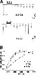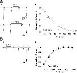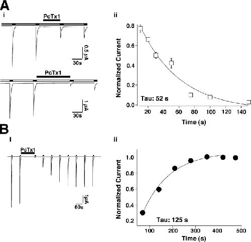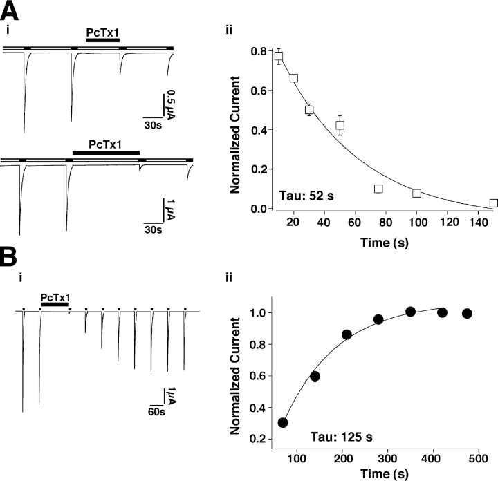 Figure 3. Kinetics of inhibition by PcTx1. (A, i) ASIC1a current traces illustrating inhibition by PcTx1. PcTx1 (30 nM) was applied for 50 and 100 s, respectively. (A, ii) Current peak amplitudes (normalized to the current amplitude before applying the toxin) are plotted against the corresponding time period of PcTx1 application. Each data point represents the mean ± SEM of 5–7 individual measurements. The time constant for onset of inhibition, obtained by fitting the mean data to a single exponential function, was 52 s. (B, i) Representative current traces of ASIC1a channels recovering from inhibition by PcTx1 (30 nM, applied for 150 s). ASIC1a channels that had recovered from inhibition were assessed every 70 s by application of pH 6. The conditioning period between channel activation was 60 s, allowing ASIC1a to fully recover from low pH–induced desensitization. (B, ii) Current peak amplitudes (normalized to the maximal current amplitude after toxin washout) are plotted against the corresponding time after washout. Each data point represents the mean ± SEM of 10 individual measurements. The time constant for recovery from inhibition was 125 ± 56 s. |