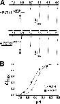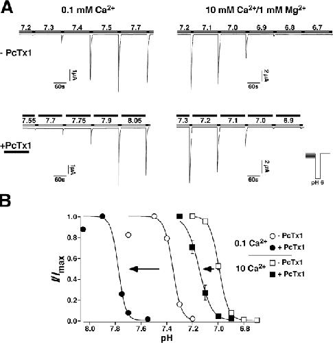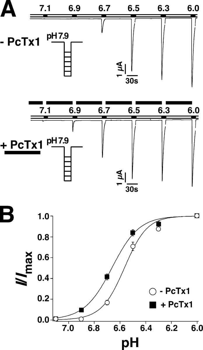 Figure 4. PcTx1 increased the apparent affinity for H+ of ASIC1a. (A) Representative current traces elicited by pH ranging from 7.1 to 6.0 with conditioning pH 7.9 (applied for 70 s). Top, without PcTx1, bottom, with PcTx1 (30 nM). (B) H+ dependence of ASIC1a activation in the absence (n = 7, open circles) or in the presence (n = 7, filled squares) of 30 nM PcTx1. PcTx1 significantly (P < 0.01) shifted the pH activation curve to lower H+ concentrations. |