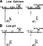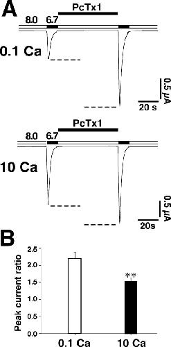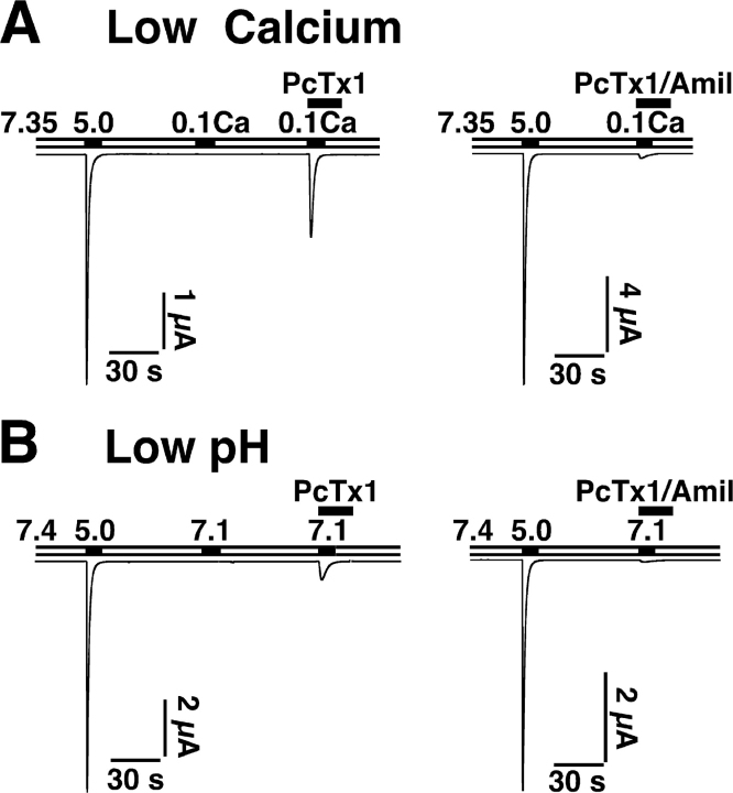 Figure 8. PcTx1 directly opens ASIC1a at certain conditions. (A) At pH 7.35, 100 nM PcTx1 elicited transient inward currents when coapplied with low Ca2+ concentrations (0.1 mM, left, n = 5). These PcTx1-elicited currents could be blocked by 100 μM amiloride (right, n = 4). (B) When coapplied with pH 7.1, 100 nM PcTx1 elicited transient inward currents (left, n = 5), which could be blocked by 100 μM amiloride (right, n = 3). |