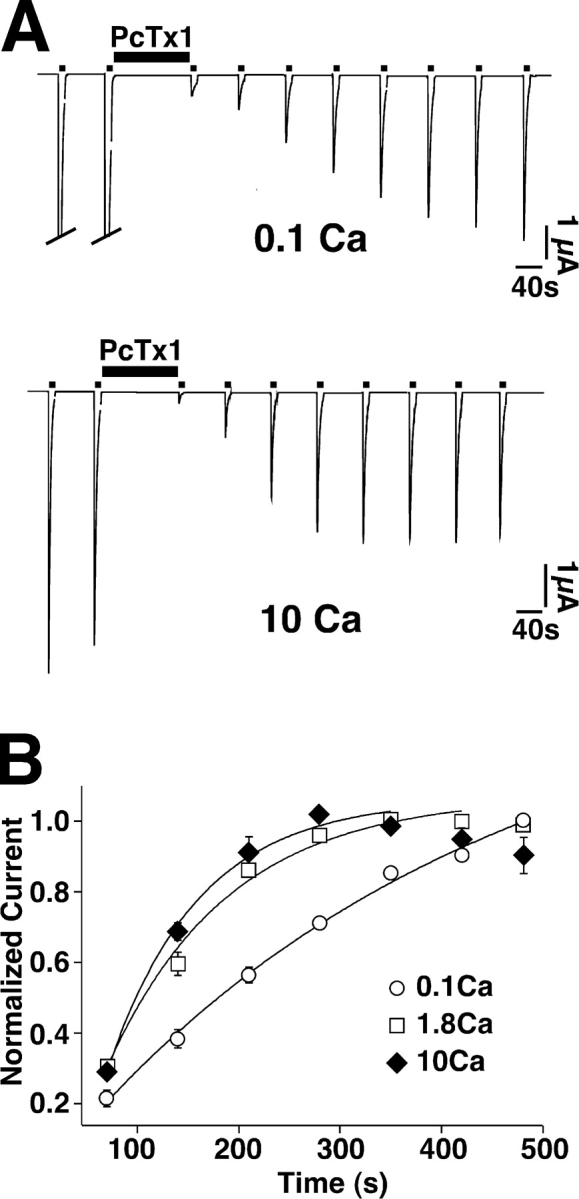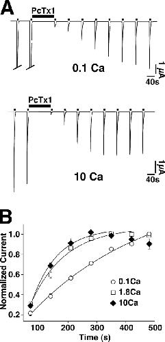 Figure 7. Ca2+ speeds recovery from inhibition by PcTx1. (A) Representative traces of ASIC1a currents recovering from the inhibition by PcTx1 (30 nM). Protocol as in Fig. 3 B, but with 0.1 mM Ca2+ and pH 7.55 (top) or 10 mM Ca2+/1.0 mM Mg2+ and pH 7.06 (bottom) during the conditioning period. The different pH values were chosen to account for the influence of Ca2+ on the speed of recovery from desensitization. (B) Current peak amplitudes (normalized to the maximal current amplitude) are plotted against the corresponding time after toxin washout. The time constants, obtained by fitting the data to a mono-exponential function, were 441 ± 141 s (0.1 Ca, open circles, n = 7), 125 ± 56 s (1.8 Ca, open squares, n = 10), and 118 ± 38 s (10 Ca, filled diamonds, n = 6). Data for 1.8 Ca2+ are from Fig. 3. |