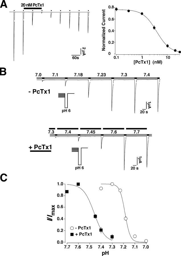 Figure 2. PcTx1 caused a robust shift of the steady-state desensitization curve of ASIC1a to lower H+ concentrations. (A) Apparent affinity of synthetic PcTx1 to ASIC1a. Left, an example of ASIC1a currents inhibited by 20 nM PcTx1 (applied for 125 s in the conditioning period). Currents were elicited by a pH drop from pH 7.4 to pH 6. Right, dose–response relationship for inhibition of ASIC1a currents by PcTx1. The first test current after PcTx1 application was normalized to the test current just before the toxin application. The line represents a fit to the Hill equation (IC50 = 3.7 nM, Hill coefficient = 1.65). Each data point represents mean ± SEM (n = 5–7). (B) Representative traces of ASIC1a currents evoked by application of pH 6.0 with varying conditioning pH as indicated. Top, without PcTx1, bottom, with PcTx1 (30 nM). Conditioning pH was applied for 120 s. Holding potential was −70 mV. (C) H+ dependence of steady-state desensitization of ASIC1a currents in the absence (open circles, n = 8) or presence (filled squares, n = 5) of 30 nM PcTx1. |