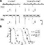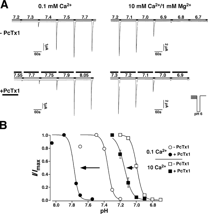 Figure 5. Ca2+ dependence of the shift of the steady-state desensitization curve. (A) Representative traces of ASIC1a currents evoked by application of pH 6.0 with varying conditioning pH as indicated. Top, without PcTx1, bottom, with PcTx1 (30 nM). Conditioning solution contained 0.1 mM Ca2+ (left) or 10 mM Ca2+/1.0 mM Mg2+ (right) and was applied for 120 s. Solution of pH 6.0 always contained 1.8 mM Ca2+/1.0 mM Mg2+. (B) H+ dependence of steady-state desensitization of ASIC1a currents in the absence (open circles, 0.1 mM Ca2+, n = 7; open squares, 10 mM Ca2+/1.0 mM Mg2+, n = 8) or presence (filled circles, 0.1 mM Ca2+, n = 6; filled squares, 10 mM Ca2+/1.0 mM Mg2+, n = 5) of 30 nM PcTx1. At low Ca2+ concentrations, PcTx1 caused a more robust shift (by 0.42 pH units) of the steady-state desensitization curve than at high Ca2+ concentrations (by 0.16 pH units). Note that Ca2+ itself also shifts the steady-state desensitization curves. |