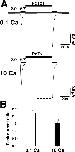 Figure 6. Ca2+ inhibits the binding of PcTx1 to ASIC1a channels. (A) 30 nM PcTx1 was applied together with either 0.1 mM Ca2+ (top) or 10 mM Ca2+/1.0 mM Mg2+ (bottom), in the conditioning solution (pH 8.0). Test solution always contained 1.8 mM Ca2+/1.0 mM Mg2+, pH 6.7. (B) The potentiation of the ASIC1a current, due to increased affinity to H+, is expressed as the ratio of peak currents after and before application of PcTx1. White bar, 0.1 Ca2+ (n = 6); black bar, 10 mM Ca2+/1.0 mM Mg2+ (n = 6). High Ca2+ significantly (P < 0.01) reduced the potentiation of ASIC1a currents by PcTx1. |