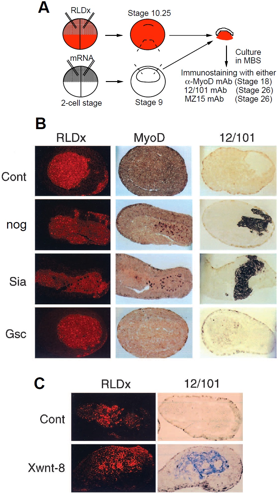 RLDx-labelled cells at stage 18; middle panels, MyoDpositive