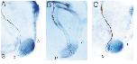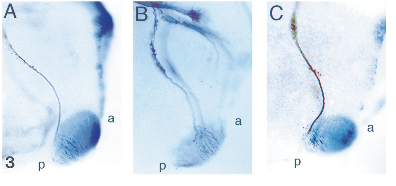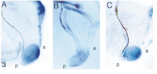 FIG. 3. Rotation of the cement gland alters trigeminal nerve behavior. Rotation experiments demonstrate that the posterior cells of the cement gland control the behavior of the mandibular trigeminal neurites. (A) Lateral view of a stage 28 tailbud control embryo stained with both the 3A10 antibody (brown staining) and the antisense XA-1 probe (purple blue staining). (B) Stage 28 embryo in which the cement gland was rotated by 1807 and reimplanted at stage 19. The neurites innervate the anterior end of the target. (C) Control embryo in which the cement gland was removed and reimplanted without rotation at stage 19. Innervation occurs at the original posterior end. In all panels anterior is to right and dorsal is at top. |