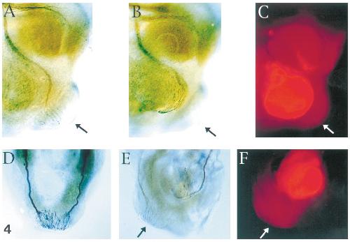 FIG. 4. Ectopically implanted cement gland competes with the endogenous target. (AâC) and (E, F) are two embryos in which an ectopic lineage-traced cement gland was implanted on one side of the embryos in the path of the mandibular branch of the trigeminal nerve and stained with 3A10. (AâC) Lateral view of the head. (E, F) Ventral view of the head. (A) Control side without implant showing the normal connection of the nerve to its target. (B) Experimental side where the implantation of an ectopic cement gland was performed. (C) The same view under UV illumination showing the implant revealed by the lineage tracer. Trigeminal neurites innervate a subset of cells in the ectopic cement gland and do not contact the endogenous cement gland of the host embryo. (D) Ventral view of the head of an unmanipulated control embryo. (E) Ventral view of the head of an embryo in which an ectopic cement gland is implanted on the path of the trigeminal nerve (right side). (F) The same view under UV illumination showing the implant revealed by the lineage tracer. The ectopic connection does not influence the behavior of the nerve on the unmanipulated side. The arrow points to the natural target of the host embryo. |