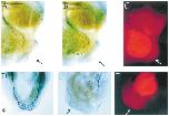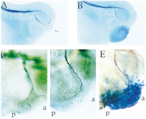 FIG. 6. Follistatin-expressing caps mimic the endogenous cement gland in controlling the mandibular trigeminal nerve behavior. Expression of the activin antagonist follistatin in animal cap induces cues modulating mandibular trigeminal nerve behavior. (A) Lateral view of tailbud stage 28 embryo stained with the 3A10 antibody, in which the cement gland was substituted by a control animal cap (arrow). The trigeminal neurites do not recognize this tissue as a target. (B) Embryo in which the cement gland is substituted with an animal cap expressing 2 ng total b-galactosidase RNA. Staining for b-galactosidase activity is shown in blue. Injection of this control RNA does not change the behavior of the neurites in the substitution assay. (C, D) The same as (B) with an animal cap expressing 2 ng total follistatin RNA. In these embryos, trigeminal neurites innervate with 50% frequency either the posterior (C) or the anterior (D) part of the implanted animal cap. (E) Double staining for 3A10 antigen and the cement gland marker XA-1. The animal explants expressing follistatin induce the cement gland marker XA-1 (blue staining). In all panels, dorsal is at top and anterior to right. |