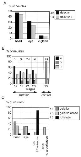 FIG. 7. Quantification of neurite behavior. (A) Trigeminal neurite behavior in embryos lacking their target. Percentage of neurites (whole nerve) with no arborization and extending toward the heart or the eye or stopping at the original site of the cement gland are shown after a complete deletion (deletion, n  39) or after partial posterior deletion (deletion P, n  18) of the cement gland. (B) Consequence of rotation performed at different embryonic stages on the behavior of the mandibular trigeminal neurites. Arborization of trigeminal neurites in the posterior (p) and the anterior (a) sides of the cement gland are indicated. (n) Embryos with no terminal arborization. (control) Embryos from which the cement gland is removed at stage 19 and reimplanted in its initial AâP orientation. Numbers of embryos are indicated at the top of the histogram. (C) Follistatin induces ectodermal explants to express cues controlling trigeminal neurite behavior. b-Galactosidase RNA is used as con- trol for RNA injection. Percentage of neurites without arborization extending toward the heart (heart), the eye (eye), or the animal cap (cap no arborization) are shown. The percentage of neurites forming a terminal arborization in the animal cap is shown (cap arborization). Numbers of embryos are indicated to the left of the legend. |