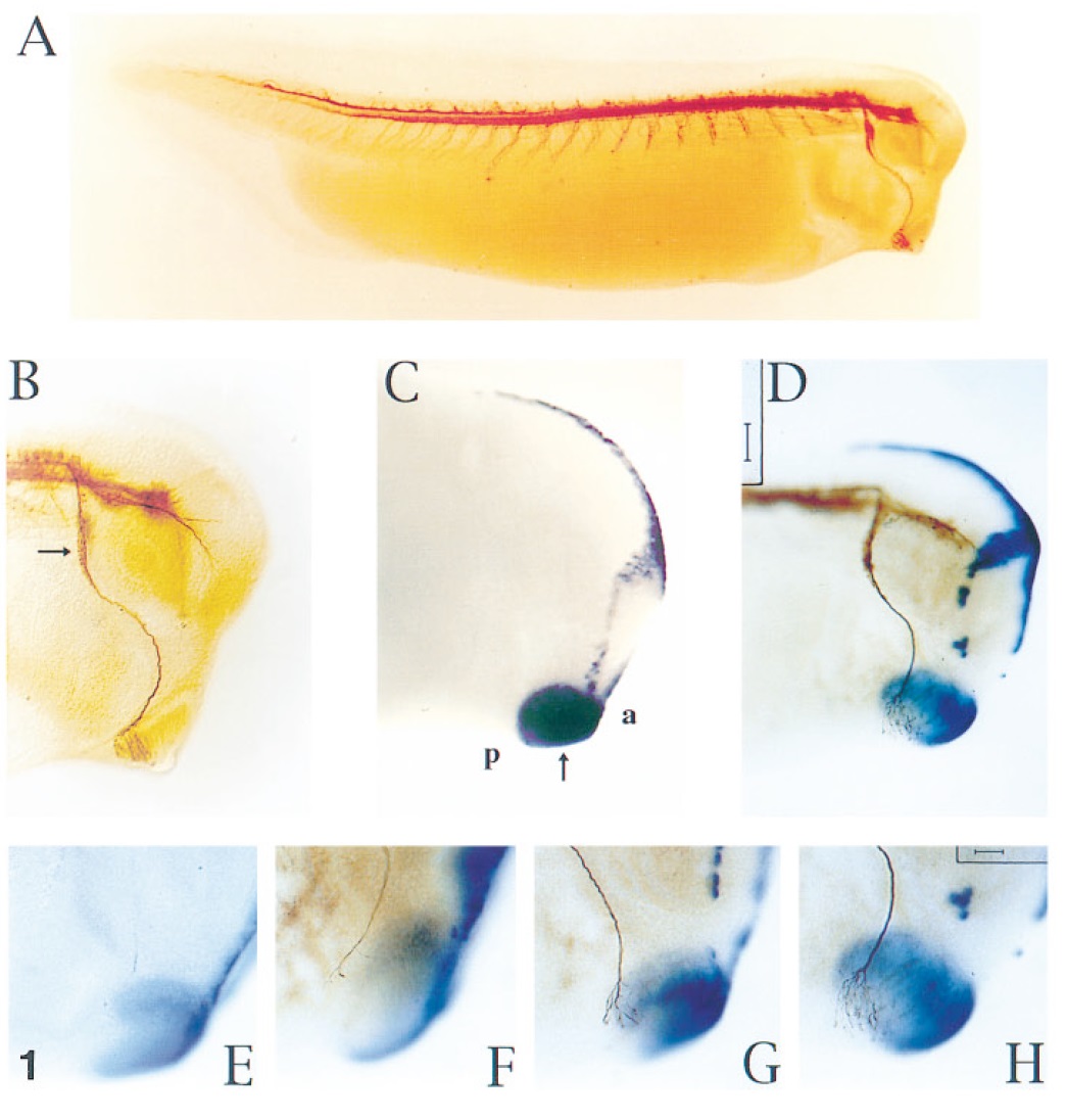 FIG. 1. Trigeminal neuritesâ outgrowth in Xenopus embryos. The mandibular trigeminal nerve innervates a subset of cells located in the posterior end of the cement gland. (A) Lateral view of a stage 28 tailbud embryo stained with the 3A10 monoclonal antibody. (B) Lateral view of the head showing neurons stained by the 3A10 monoclonal antibody in tailbud embryo. The mandibular trigeminal ganglion is indicated by an arrow. (C) Whole-mount in situ hybridization of tailbud embryo using an antisense XA-1 probe to highlight the target of the mandibular branch of the trigeminal neurites, the cement gland (arrow). The anterior (a) and posterior (p) of the cement gland are indicated. (D) Double whole-mount immunochemistry with the 3A10 antibody (brown staining) and whole-mount in situ hybridization with antisense XA-1 probe (purple blue staining). The growth cones contact the posterior end of the cement gland. (EâH) Developmental profile of cement gland innervation by trigeminal neurites. (E) Stage 24 embryo. (F) Stage 25 embryo. (G) Stage 26 early tailbud embryo. (H) Stage 28 embryo. In all panels, anterior is to right and dorsal is at top. In D, the scale bar represents 100 mm and in EâH, 50 um. |