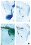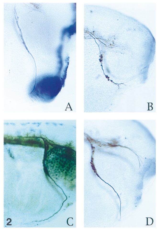FIG. 2. Deletion of the cement gland impairs the formation of the trigeminal nerve arborization formation. Embryos were double stained as whole-mounts with the 3A10 antibody (brown staining) and with the antisense XA-1 probe (purple blue staining). (A) Lateral view of the cement gland of an unperturbed embryo control at tailbud stage. (B) Trigeminal neurites grow toward the eye of the tadpole. (C) Trigeminal neurites grow toward the heart. (D) Trigeminal neurites grow toward the initial location of the target and stop without forming arborization. All embryos are albinos except for (C). In this embryo the eye is visible. In all panels, dorsal is at top and anterior is to right. |