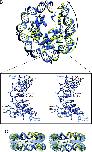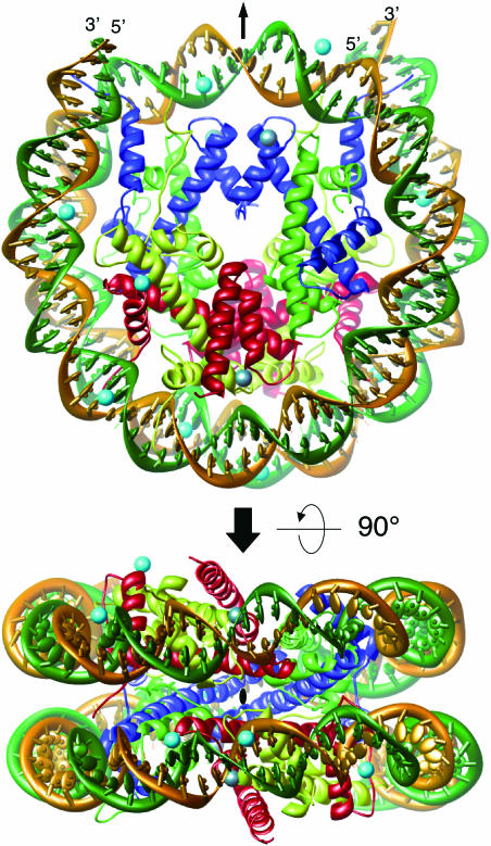 Figure 1. The overall structure of a human NCP. The upper ribbon model is the crystal structure of a human NCP. The arrow above NCP indicates a pseudo 2-fold axis passing through the center of the structure. The bottom figure displays the axial view of the particle. Histone chains are colored blue for H3, green for H4, yellow for H2A and red for H2B. The DNA is shown in ribbon traces for the 146 bp DNA phosphodiester backbones (brown for the I chain and forest green for the J chain). The Mn2+ and Cl− ions are depicted by cyan and silver balls, respectively.