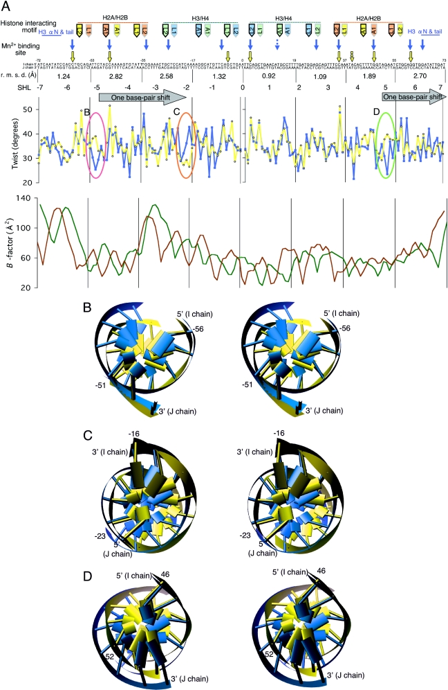 Figure 2. Comparison of the DNA parameters between human and X.laevis NCPs. (A) B-factors of phosphates, metal binding sites, r.m.s.d. values and twist base-pair-step parameter of the 146 bp DNA compared between human and X.laevis NCPs. The base pair numbers (−72 to 73) and SHL (−7 to 7) labels are the same as those in the earlier structures (11,12). The primary bound-phosphate groups are indicated above the base sequence by the pointers showing the strand direction (dark, 3′→5′; light, 5′→3′) and the interacting histone motif (L1, loop1; L2, loop 2; A1, α1). B-factors (Å2) are plotted for the 5′ phosphate group of each base (brown for the I chain and forest green for the J chain). Mn2+ binding sites are indicated above the base sequence by the yellow and light blue arrows (solid, binding the DNA major groove; broken, binding the DNA minor groove) in the structures of human and X.laevis NCPs (PDB code 1KX3) (11), respectively. The r.m.s.d. values below the base sequence were calculated by the superposition of 18 or 19 bp between two NCPs. The twist base-pair-step parameters were plotted as open circles and closed squares for the human (yellow line) and X.laevis (light blue line) nucleosomal DNA, respectively. The pink, orange and green ellipsoids of the twist parameters represent the corresponding regions illustrated by those in Figures 3A and B and Figure 4A. (B–D) The simplified stereo model of the DNA duplexes in the regions surrounded by the ellipsoids in (A). The differences in helical twist are shown by the superposition between human (yellow) and X.laevis (light blue; PDB code 1KX3) (11) NCPs, based on the histone octamers alone. Numbers presented for each base pair are the same as those in Figure 2A.