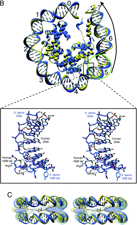 Figure 3. Comparison of the DNA structures between human and X.laevis NCPs. The best superposition between human (yellow) and X.laevis (light blue; PDB code 1KX3) (11) NCPs, based on the histone octamers alone, reveals the discrepancy in the DNA structures. (A and B) Partial NCP structure, viewed as the upper display in Figure 1, but showing only 77 bp and associated proteins. The black arrows indicate the directions and ranges of the consecutive 1 bp shifts to the 3′-side, in comparison with the DNA in Xla-NCP. The pink, orange and green circles correspond to those in Figures 2A and 4A. Each SHL label of −1 to −7 or 1 to 7 represents one further DNA double helix turn from SHL0, which is located at the central base pair numbering as zero in Figure 2A. The close-up inset indicates a H2B tail, whose positional change may induce the local alteration of the DNA path. In the close-up stereo view, all of the atoms of a human NCP are shown as normal sticks, where the phosphorus, oxygen and nitrogen atoms are colored cyan, red and blue, respectively, and all of the Xla-NCP atoms are shown as light blue sticks. (C) The side stereo view, corresponding to the lower display in Figure 1, but representing the superhelical DNA pathway alone. The broken ellipsoids, shadowed yellow and light blue, represent the space between two DNA duplexes within human and X.laevis NCPs, respectively. The black arrows indicate the expanding distance between the same sugar–phosphate backbones of two NCPs.