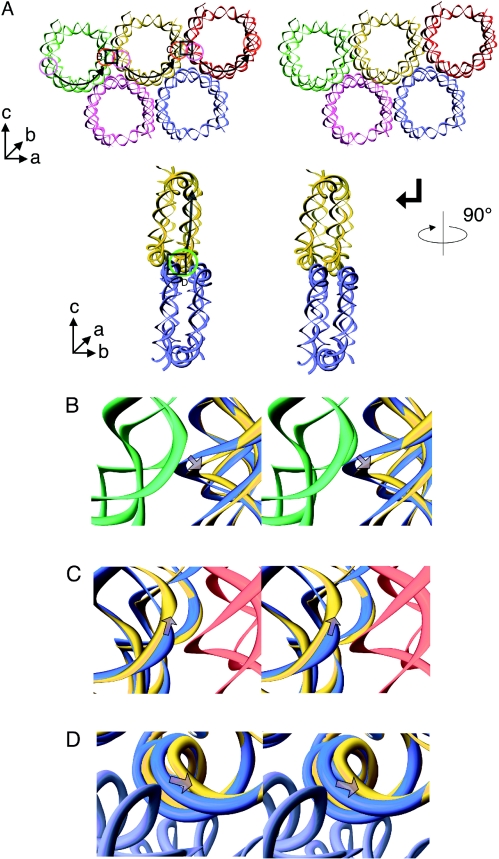 Figure 4. Crystal packing of human NCP. (A) The upper stereo model shows the human NCP crystal packing, viewed approximately perpendicular to the crystallographic c-axis. The bottom figure displays the side view of the same molecular arrangements. Short arrows show the approximate locations of the three crystallographic axes. Only the DNA backbone is shown for clarity. The pink, orange and green circles are equivalent with the regions illustrated by those in Figures 2A and Figures 3A and B. The black arrows indicate the directions and ranges of the consecutive 1 bp shifts to the 3′-side. (B–D) The close-up stereo views of the boxed area in (A) show the discrepancy in the DNA structures by the superposition between human (yellow) and X.laevis (light blue; PDB code 1KX3) (11) NCPs, based on the histone octamers alone. The gray arrows represent the modification of the DNA pathway by the inter-particle collides.