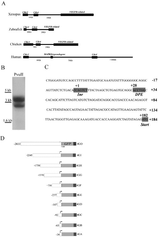 Fig. 1. Identification of the X. laevis Cdx4 promoter. Panel A is a schematic diagram showing the genomic context of Cdx4-related loci in X. tropicalis, zebrafish, chicken, and human. Panel B shows an autoradiograph of a Southern blot of X. laevis genomic DNA digested with PvuII restriction enzyme and probed with a 400-bp probe from the 5′ end of the Cdx4 cDNA. Note the two bands arising from sequence polymorphism of the two pseudoallelic Cdx4 genes. Panel C shows the sequence from the proximal promoter region of X. laevis Cdx4. Transcriptional initiator sequence (Inr), downstream promoter element (DPE), and translational start (start) are boxed in gray. Sequence is numbered relative to the transcription start site +1. Panel D shows diagrams of the GFP reporter plasmids made from the isolated 3.4-kb Cdx4 promoter fragment. The base construct 4GO contains 2833 bp upstream of the transcription start site and 168 bp of 5′ untranslated region (UTR) cloned upstream of a nuclear GFP reporter. The construct also contains a 3′ SV40 adenylation sequence. Constructs 4GI to 4GA represent a deletion series (2245 bp to 24 bp) of the sequence upstream of the transcriptional start site.