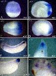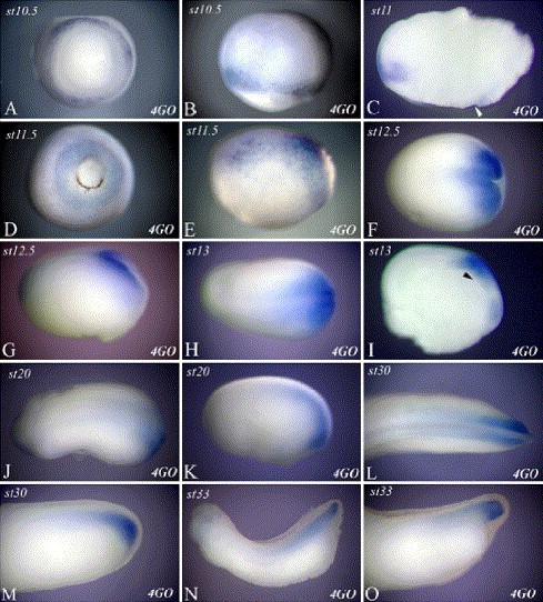 Fig. 3. Expression of the 4GO reporter in transgenic embryos during development. This figure shows the expression of the 4GO reporter construct in transgenic embryos at a number of developmental stages as visualized by in situ hybridization against GFP RNA. The 4GO construct contains 2.8 kb upstream of the transcription start site. In Panels E to O, anterior is to the left. Panel A is a vegetal view of a gastrula stage 10.5 embryo. Dorsal is to the top. Panel B is a lateral view of a stage 10.5 embryo. The animal hemisphere is to the top. Panel C is a section of a gastrula stage 11 embryo bisected along the dorsoventral axis. Animal is to the top dorsal to the right. White arrow indicates the blastpore lip. Panel D is a vegetal view of a stage 11.5 embryo. Dorsal is to the top. Panel E is a lateral view of a stage 11.5 embryo. Dorsal is to the top. Panel F is a dorsal view of a gastrula stage 12.5 embryo. Panel G is a lateral view of a stage 12.5 embryo. Panel H is a dorsal view of an early neurula stage 13 embryo. Panel I is a sagittal section of a stage 13 embryo. Back arrow indicates forming archenteron cavity. Panel J is a dorsal view of a late neurula stage 20 embryo. Panel K is a lateral view of a stage 20 embryo. Panel L is a dorsal view of the posterior region of tailbud stage 30 embryo. Panel M is a lateral view of the posterior region of a stage 30 embryo. Panels N and O are lateral views of tailbud stage 33 embryos.