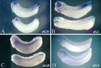 Fig. 7. Expression from a 5′ deletion series of the proximal promoter region in transgenic embryos. This figure shows the expression in transgenic tailbud stage embryos from a series of reporter constructs containing 5′ deletions of the proximal promoter region of Cdx4 visualized by hybridization against GFP RNA. The 4GD, 4GC, 4GB, and 4GA constructs contain, respectively, 187, 92, 63, and 24 bp of sequence upstream of the transcriptional start site. In all panels, anterior is to the left. Panels A, B, C, and D show the expression of constructs 4GD, 4GC, 4GB, and 4GA, respectively.