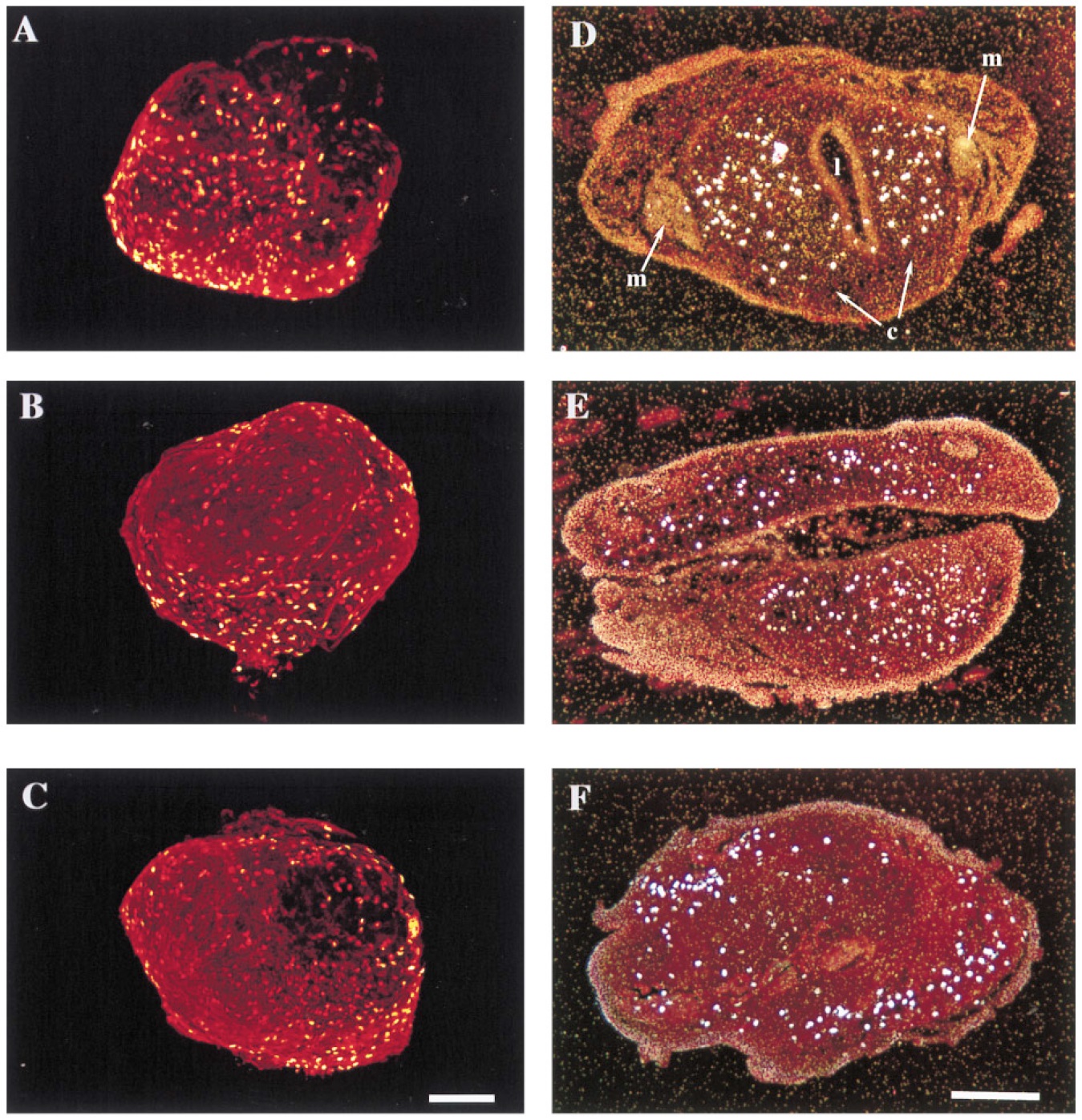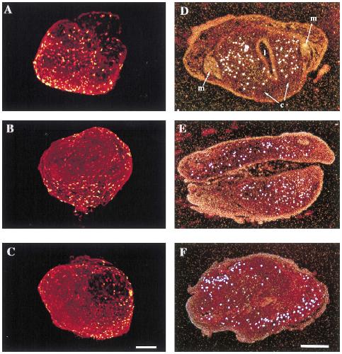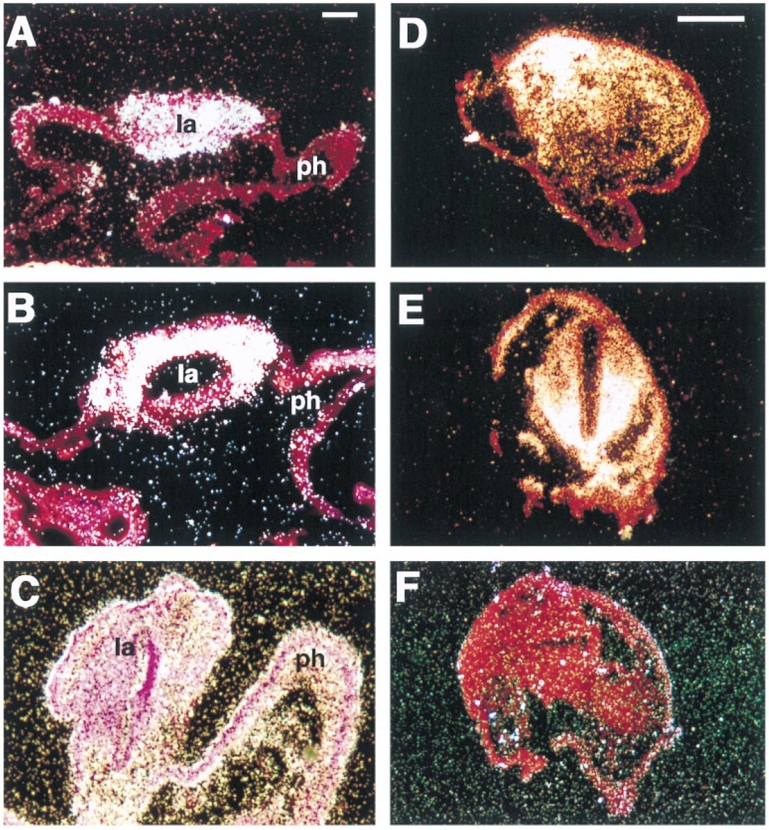 FIG. 7. Hormone receptor gene expression in tadpole (AâC) and explant (Dâ F) larynges. Sections were hybridized in situ to S35 riboprobes