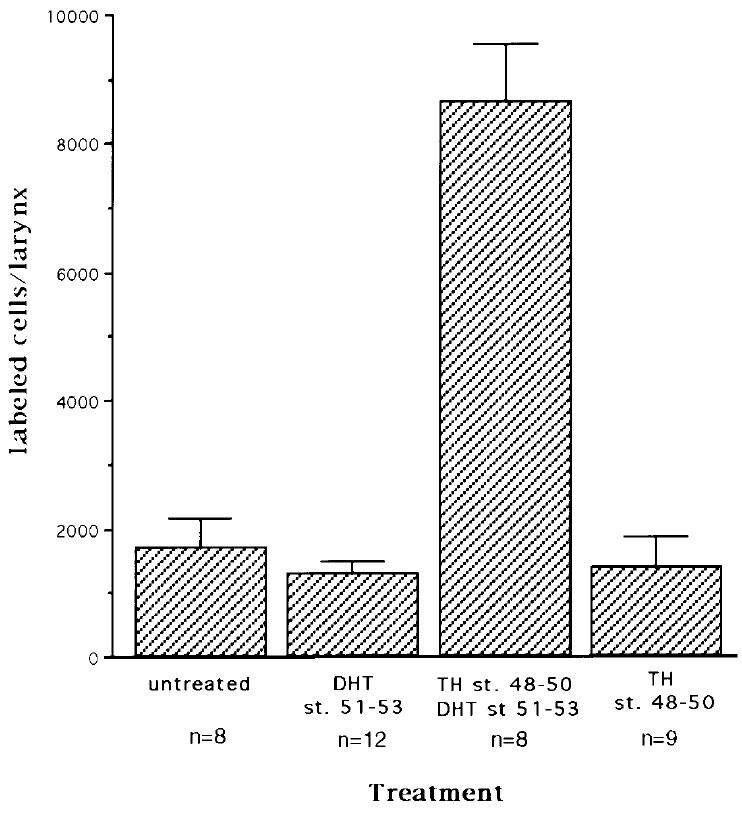 FIG. 4. The effects of hormone treatments on laryngeal cell proliferation in PM2 juveniles. The number of labeled cells/total number